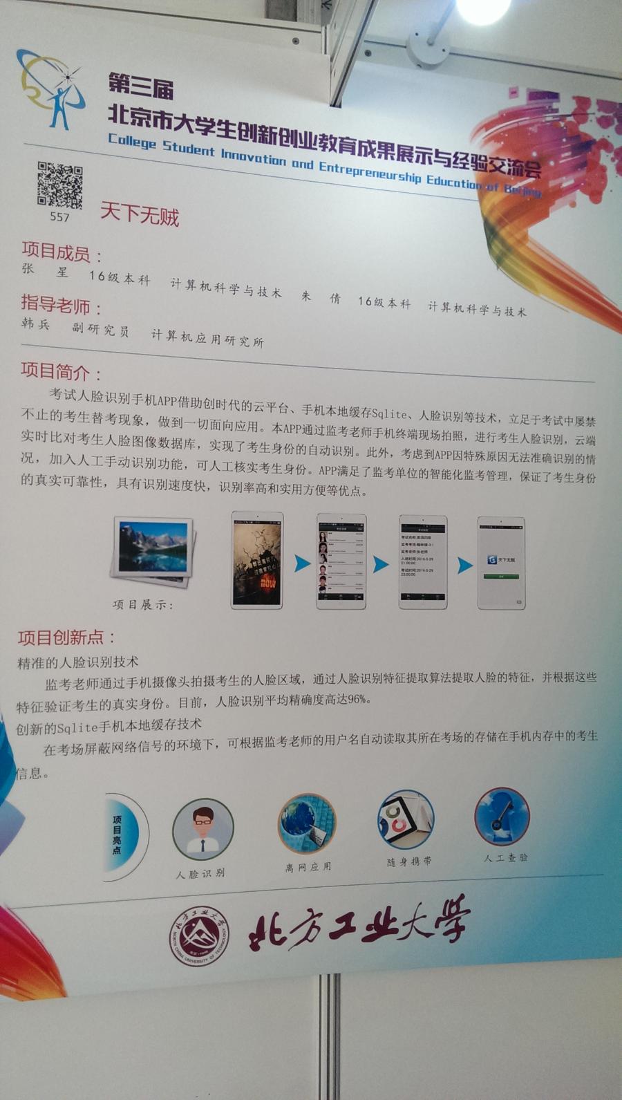 由我校教师韩兵老师指导,我院2016级计算机科学与技术专业学生张星、朱倩研发的“天下无贼”——考试人脸识别手机APP项目应邀参加此次展出。前来参观的部分师生对此项目产生了兴趣,并在现场进行了亲身体验。此次参展展示了我校9728太阳集团学生的计算机设计应用水平,对广大在校生产生了鼓舞作用。此前该项目已荣获2016年北京高等学校继续教育大学生计算机设计应用竞赛二等奖。